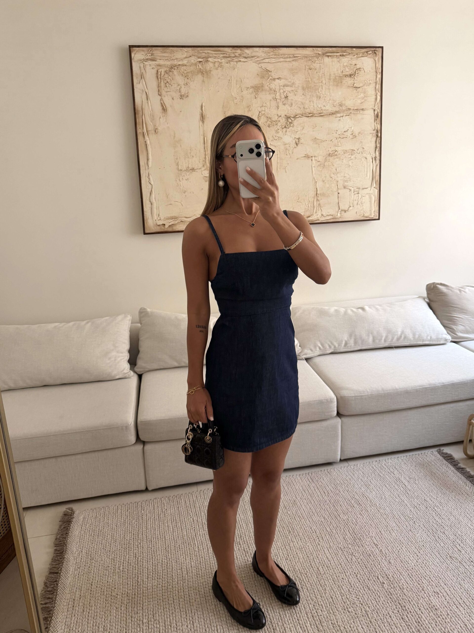 این پیراهن جین سرمهای تیره از ZARA یه قطعه تابستونیِ minimalistه که استایل رو با finesse (دقت) بالا میبره — جذب، کوتاه و آماده برای لحظات شهری، از سلفیهای خانگی تا گردشهای شبانه.